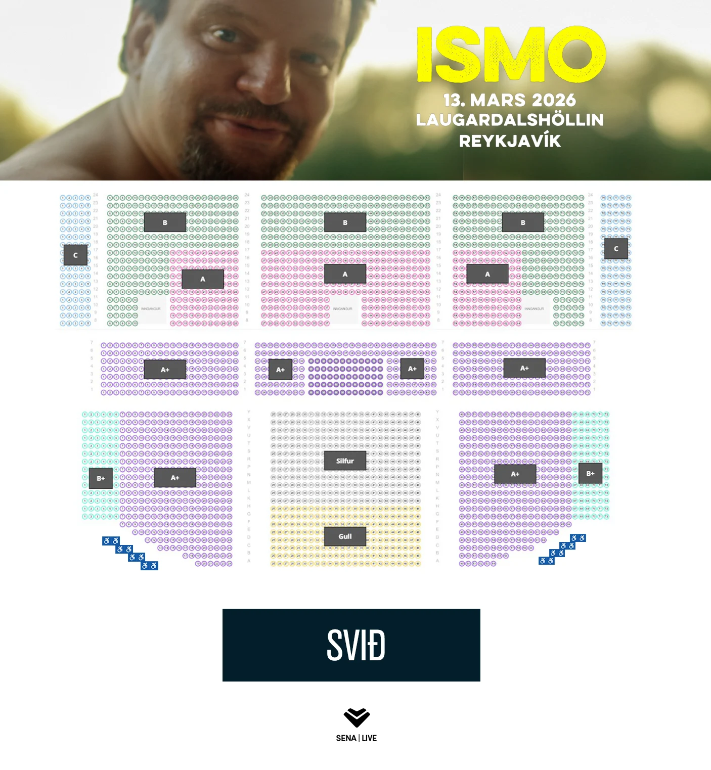 - Hjólastólasvæði: 2.995 kr. (blátt á mynd). Einnig þarf að kaupa miða fyrir fylgdar/aðstoðarmanneskju.