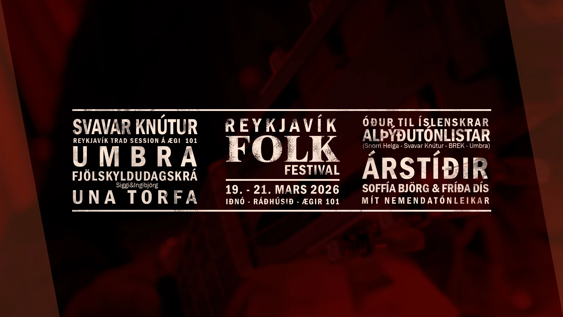 Aðaldagskrá Reykjavík Folk Festival fer fram í Iðnó föstudaginn 20. mars og laugardaginn 21. mars.